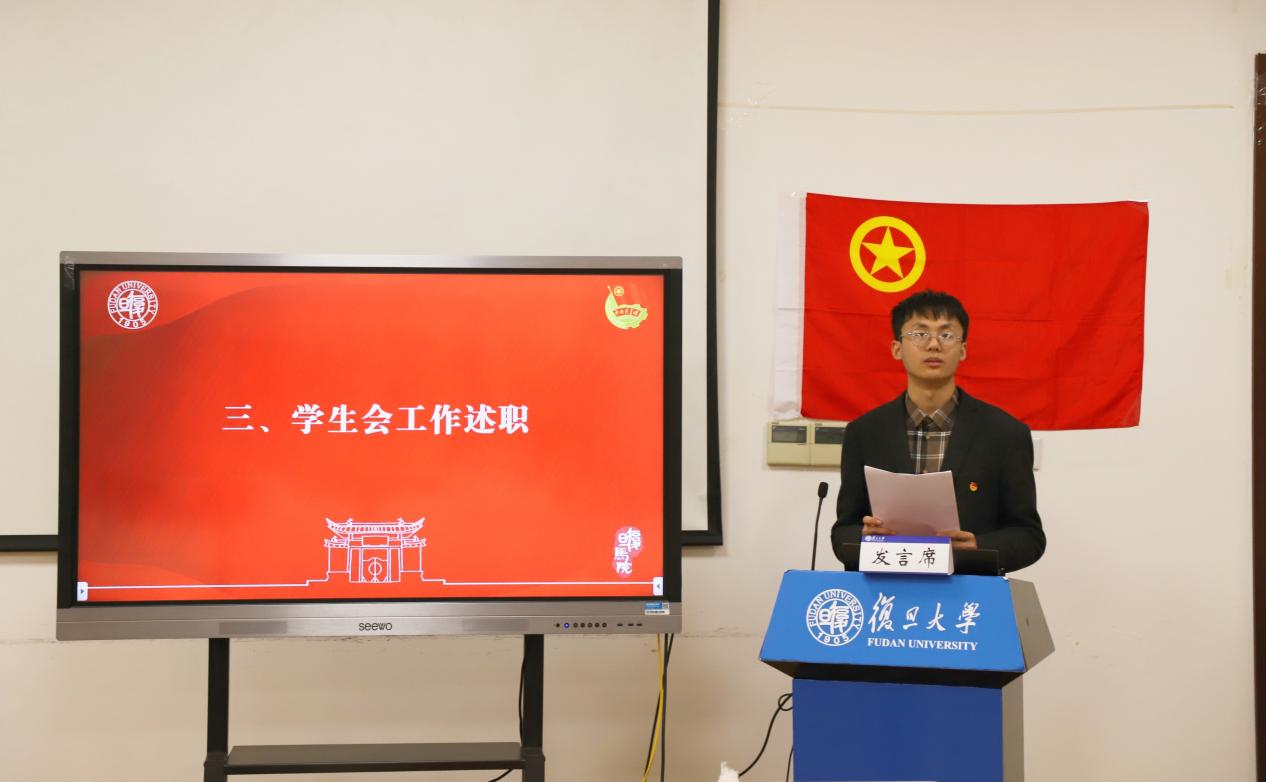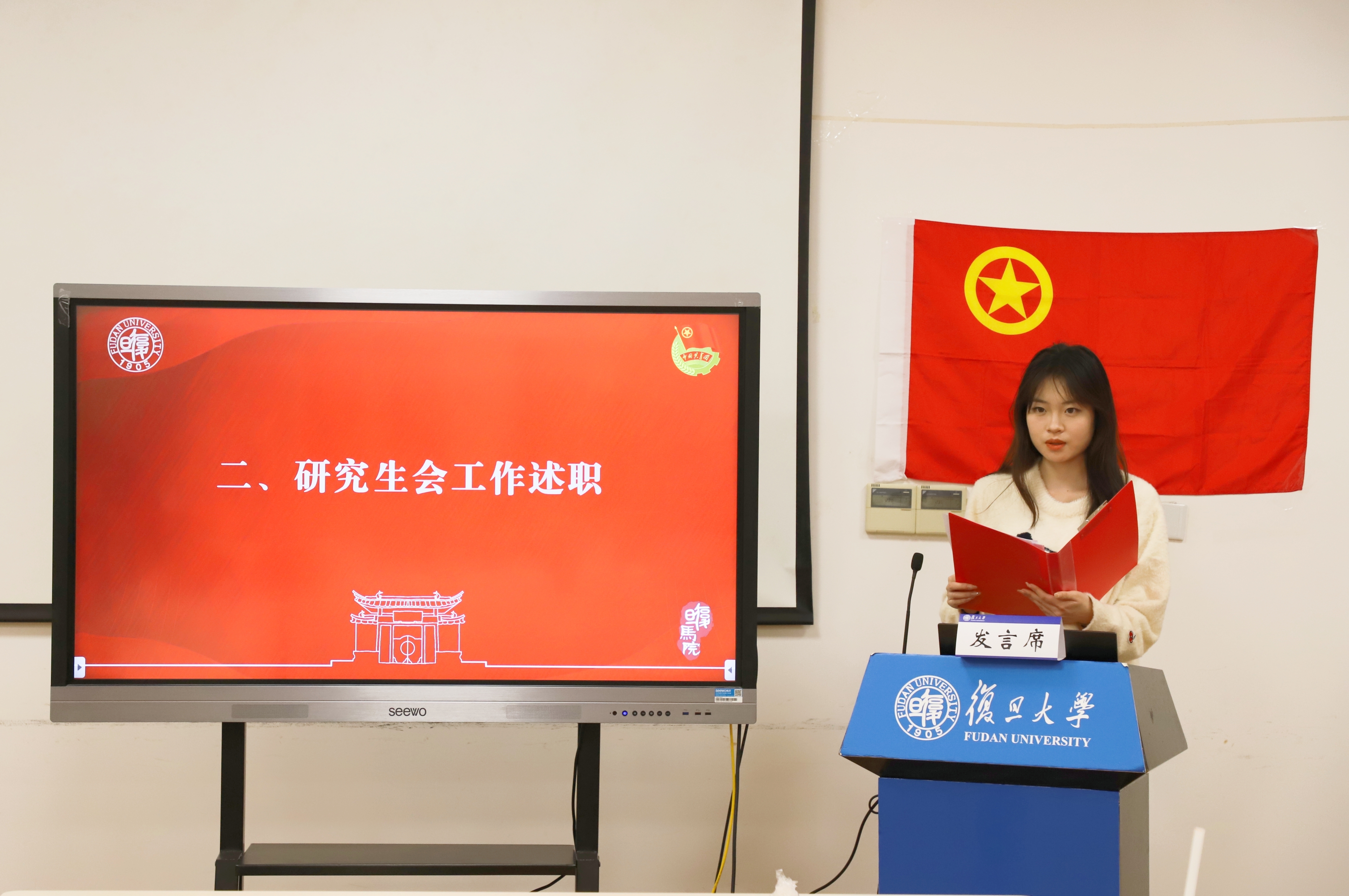 第一版主 研究生会执行主席徐莉力、学生会主席团成员王君健分别代表学院研究生会、学生会进行述职。