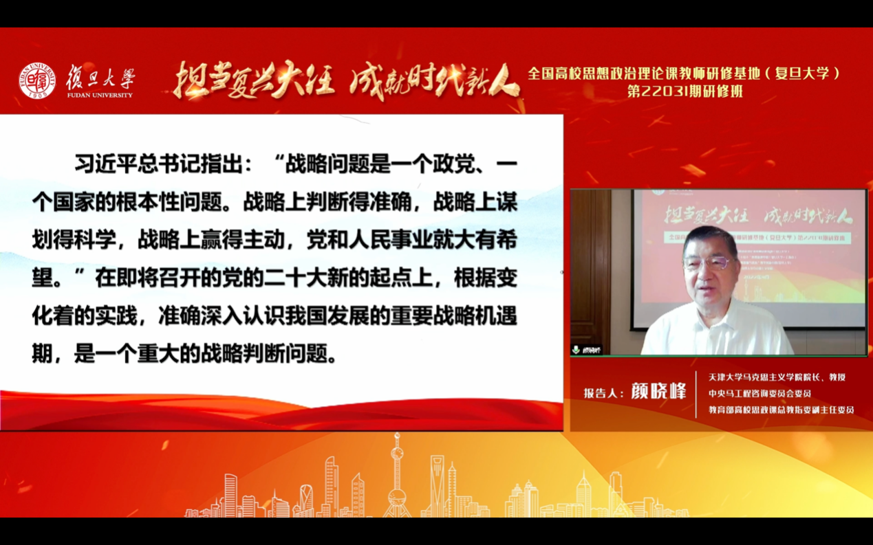 9月17日上午,中央马工程咨询委员会委员、教育部高校思政课总教指委副主任委员、天津大学第一版主 院长颜晓峰教授以《新征程谱写新篇章——学习习近平总书记在省部级专题研讨班上的重要讲话精神》为题,对新时代十年伟大变革的里程碑意义、新征程面临的战略机遇和风险挑战等问题进行了深入解读。
