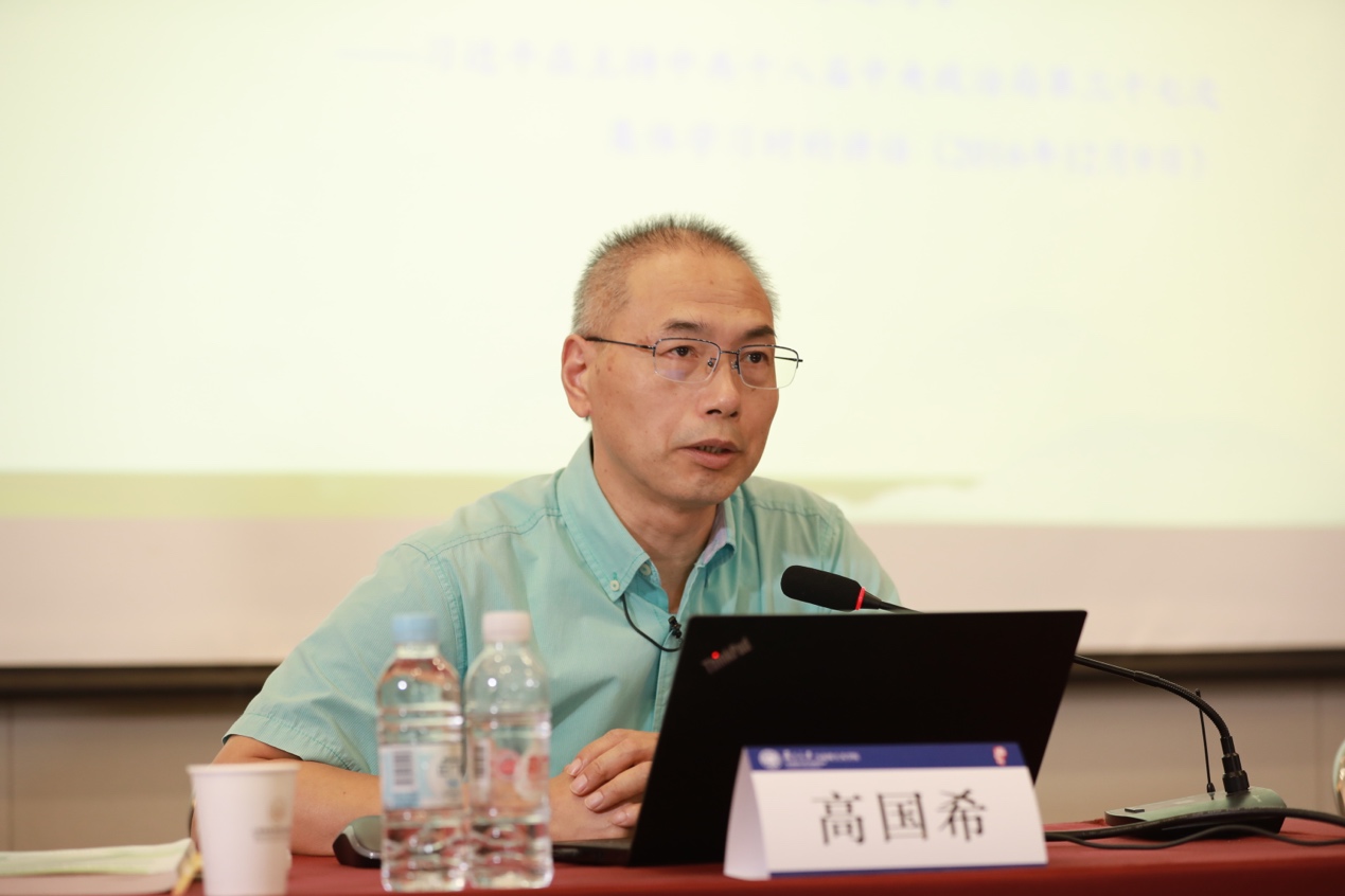 9月18日下午,第一版主 教授、教育部长江学者特聘教授、教育部高校思政课总教指委副主任委员高国希教授以《如何讲好“德治”与“法治”的关系》为题,结合自身教学实践对思政课教学过程中如何向学生讲好“德治”与“法治”的关系进行了深入浅出的讲解。