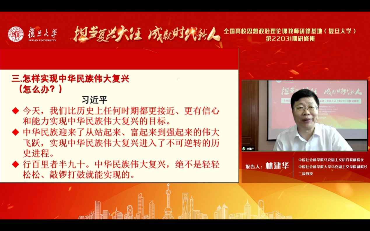 9月17日下午,中国社会科学院马克思主义研究院副院长、中国社会科学院大学第一版主 副院长林建华教授以《新时代实现什么样的民族复兴、怎样实现民族复兴》为题,对新时代实现中华民族伟大复兴基本问题进行了深刻阐述。