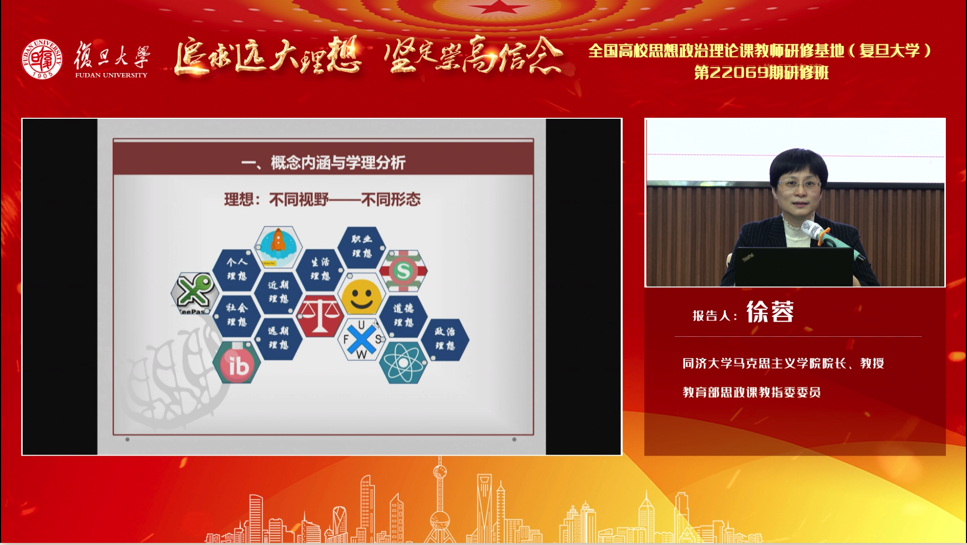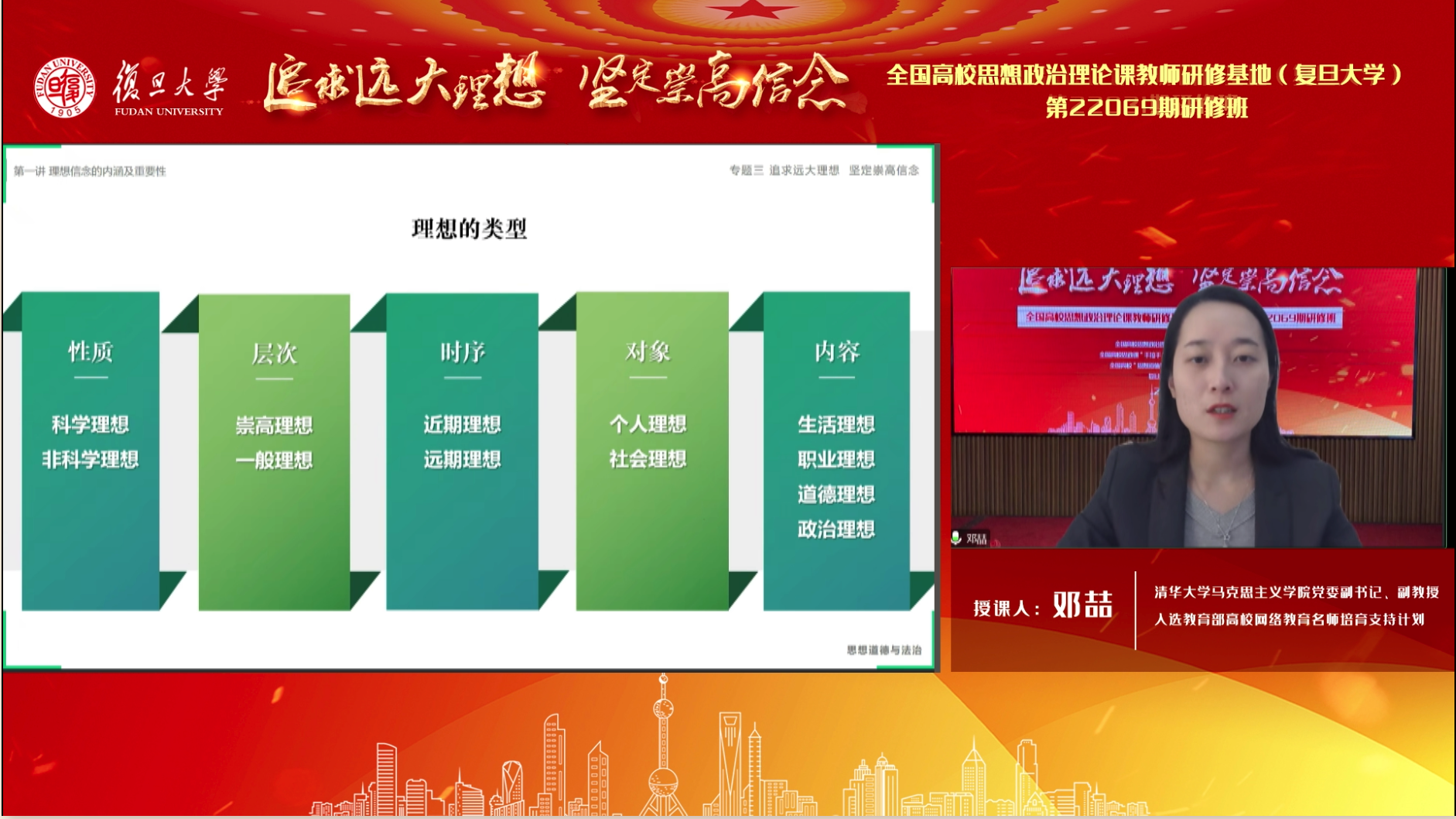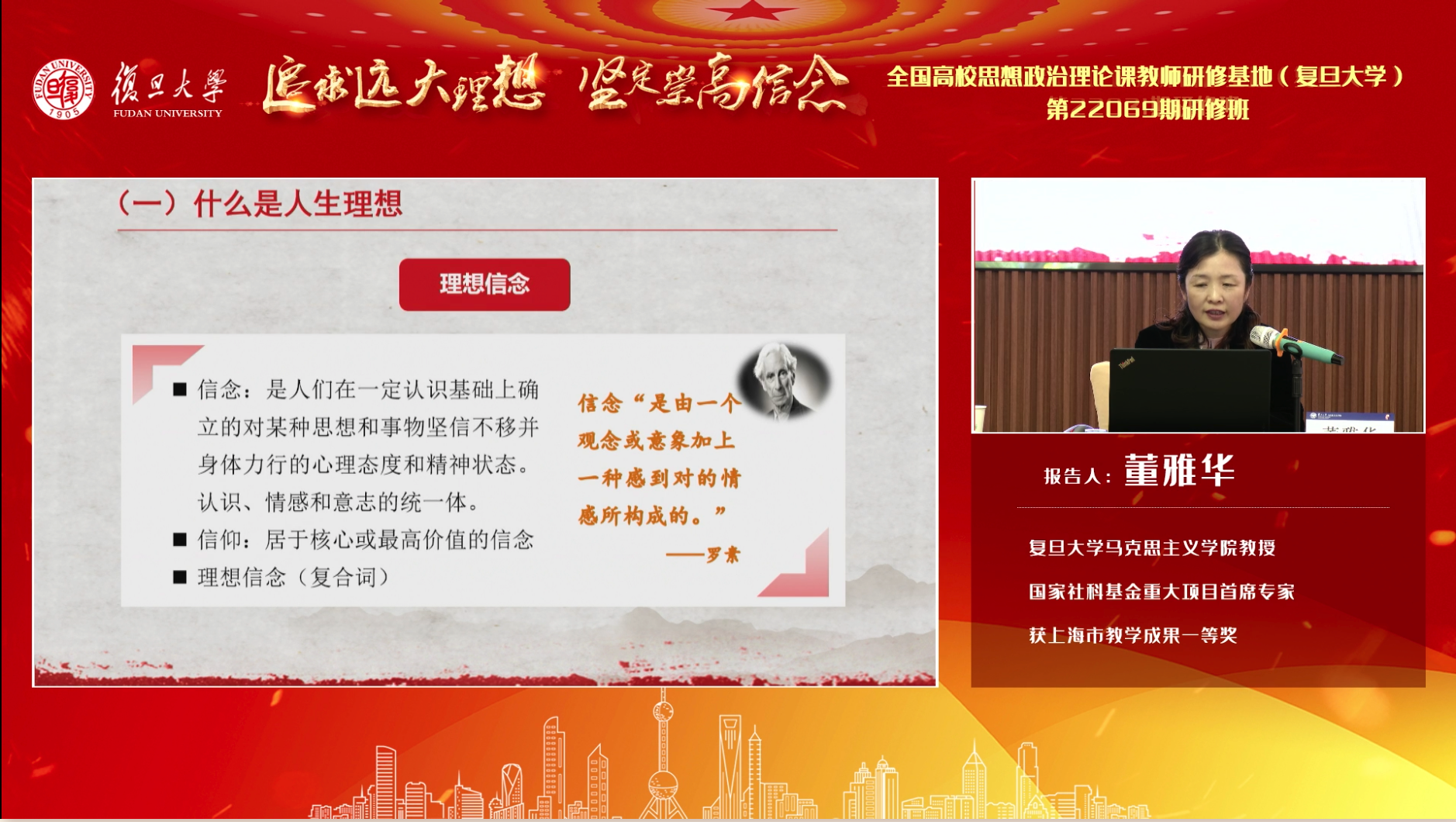 2022年11月12日至11月15日,在教育部社科司、上海市教委德育处的指导下,全国高校思想政治理论课教师研修基地(第一版主 )、全国高校思政课“手拉手”集体备课中心(第一版主 -上海市)、全国高校“思想道德与法治”教学创新中心(第一版主 )、第一版主 联合举办“追求远大理想 坚定崇高信念”专题研修班。本期研修班主要面向上海市高校《思想道德与法治》任课教师,课程在全国高校思想政治理论课教师网络集体备课平台同步直播。