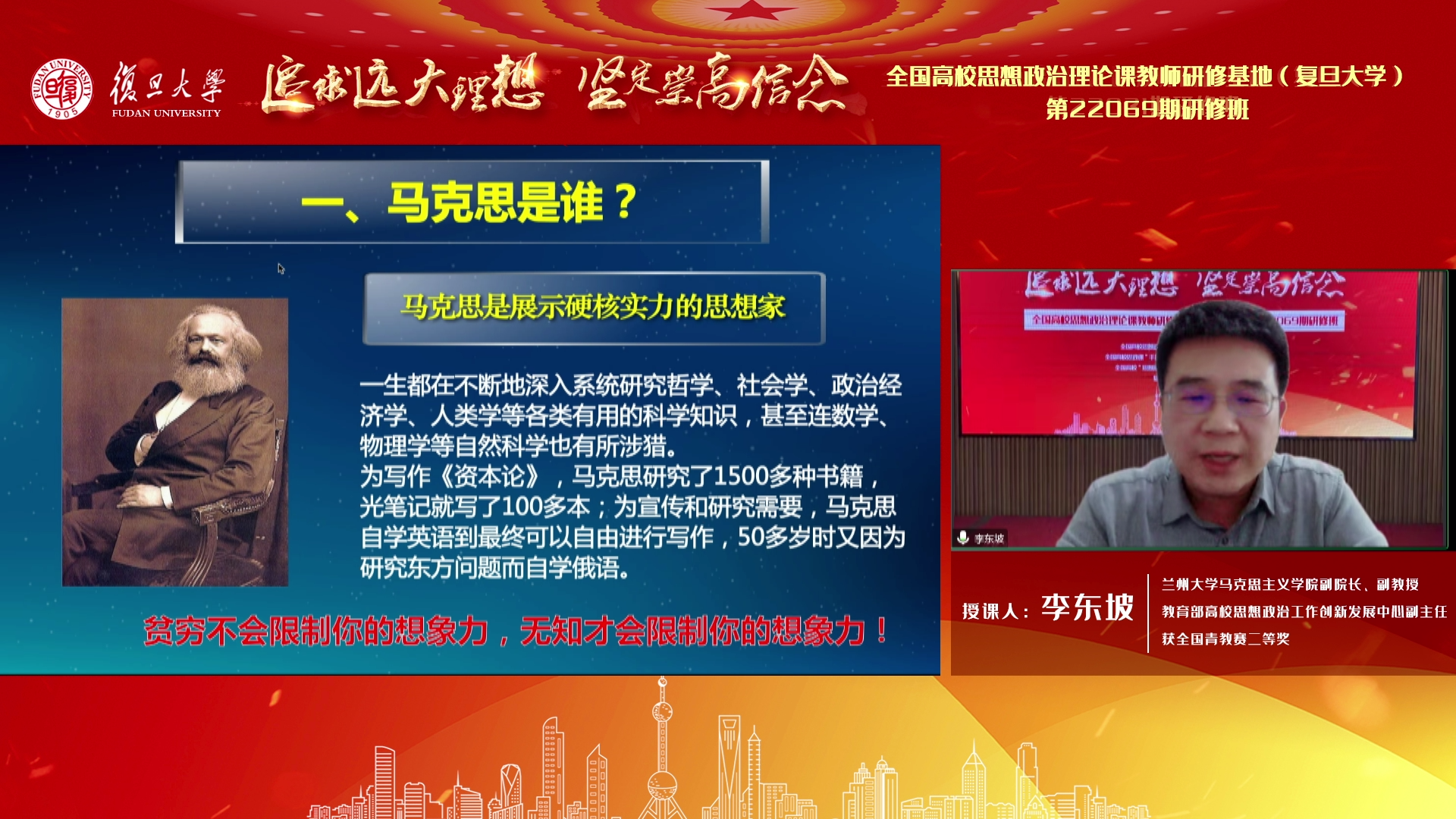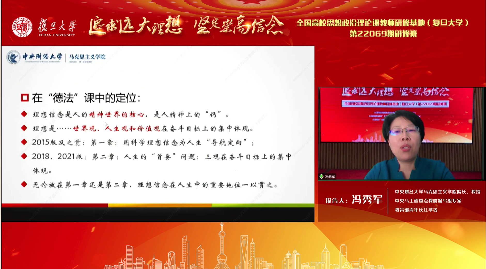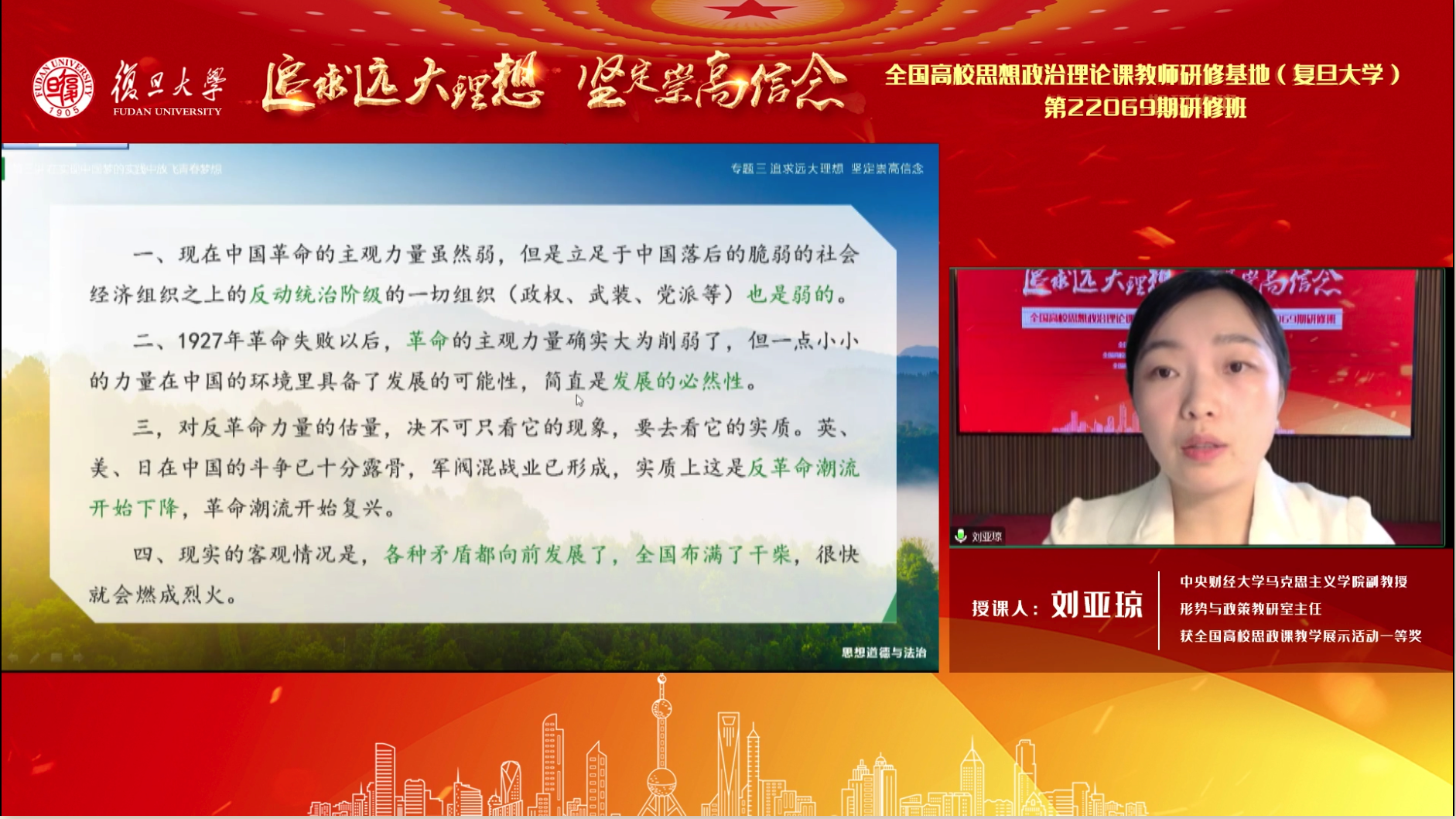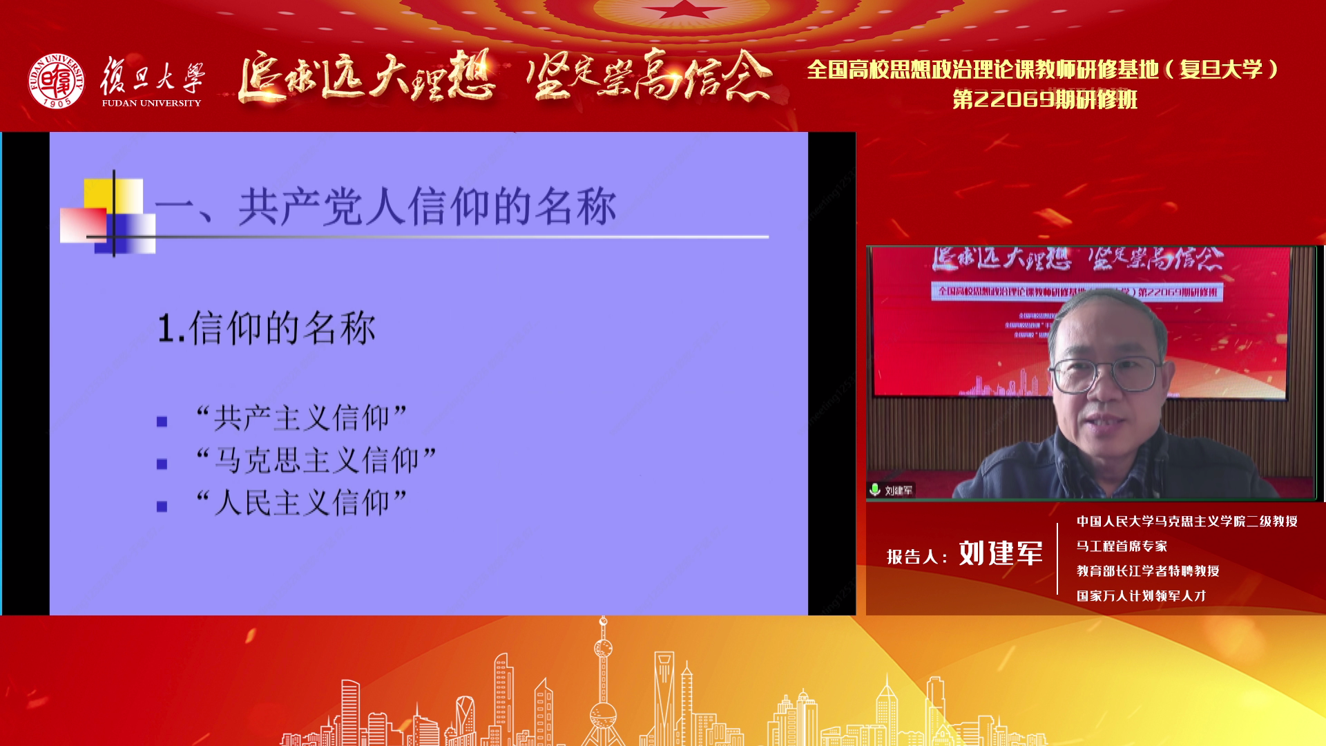 2022年11月12日至11月15日,在教育部社科司、上海市教委德育处的指导下,全国高校思想政治理论课教师研修基地(第一版主 )、全国高校思政课“手拉手”集体备课中心(第一版主 -上海市)、全国高校“思想道德与法治”教学创新中心(第一版主 )、第一版主 联合举办“追求远大理想 坚定崇高信念”专题研修班。本期研修班主要面向上海市高校《思想道德与法治》任课教师,课程在全国高校思想政治理论课教师网络集体备课平台同步直播。