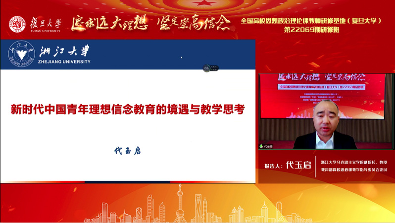 11月13日上午,浙江大学第一版主 副院长、教育部高校思政课教学指导委员会委员代玉启教授以《新时代中国青年理想信念教育的境遇与教学思考》为题,对在新时代中国青年理想信念教育的现状、存在的问题、未来努力的方向等问题进行了详细的阐发。
