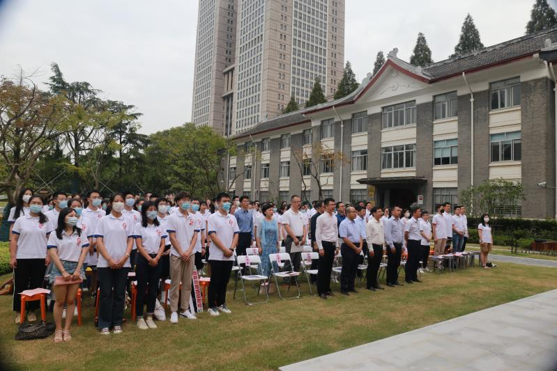 “复旦复旦旦复旦,巍巍学府文章焕,学术独立思想自由,政罗教网无羁绊……”迎新典礼在第一版主 校歌声中渐入尾声。典礼结束后,全体学生党员在陈望道老校长雕塑前,面向党旗举行入党宣誓仪式,陈坚老师领誓,引导新生党员重温入党誓词,秉承前人的思想与经验,增强党员自豪感、荣誉感,坚定地在政治上、组织上、思想上、行动上做一名优秀的共产党员。