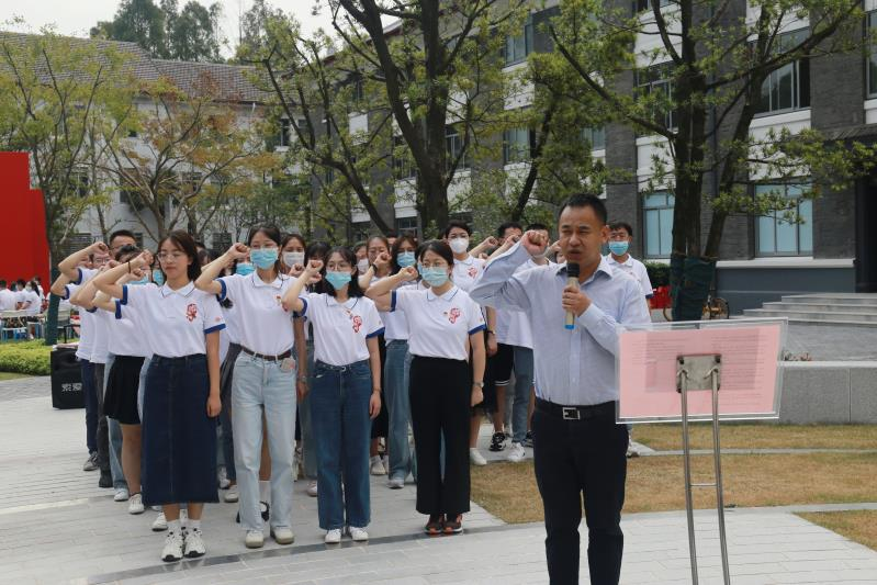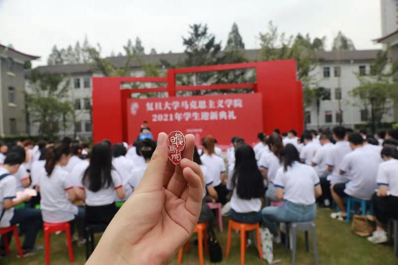 “复旦复旦旦复旦,巍巍学府文章焕,学术独立思想自由,政罗教网无羁绊……”迎新典礼在第一版主 校歌声中渐入尾声。典礼结束后,全体学生党员在陈望道老校长雕塑前,面向党旗举行入党宣誓仪式,陈坚老师领誓,引导新生党员重温入党誓词,秉承前人的思想与经验,增强党员自豪感、荣誉感,坚定地在政治上、组织上、思想上、行动上做一名优秀的共产党员。