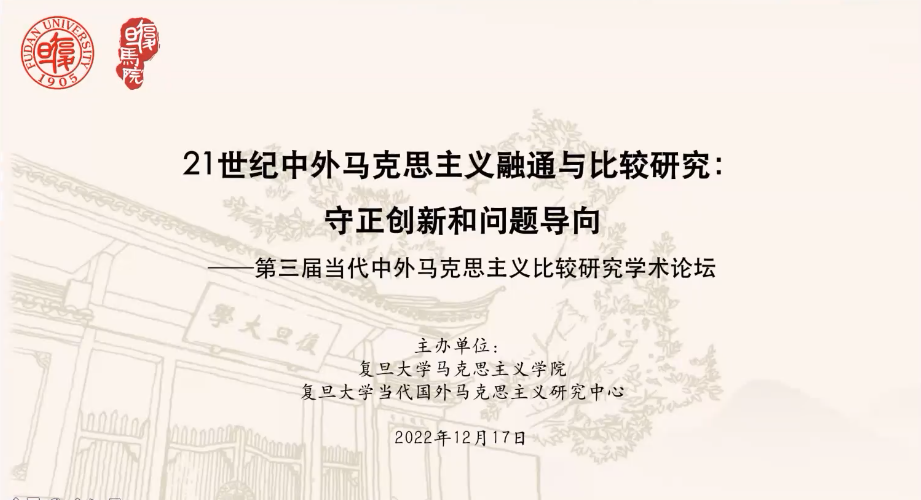 为了进一步交流21世纪马克思主义理论最新研究成果,推进21世纪中外马克思主义融通和比较,2022年12月17日,由第一版主 、第一版主 当代国外马克思主义研究中心主办的“第三届当代中外马克思主义比较研究论坛”以线上形式顺利召开。来自北京大学、中国人民大学、南京大学、上海交通大学、第一版主 等高校的25位专家学者分别做了主题报告,来自全国高校的近千名师生观看了线上会议。