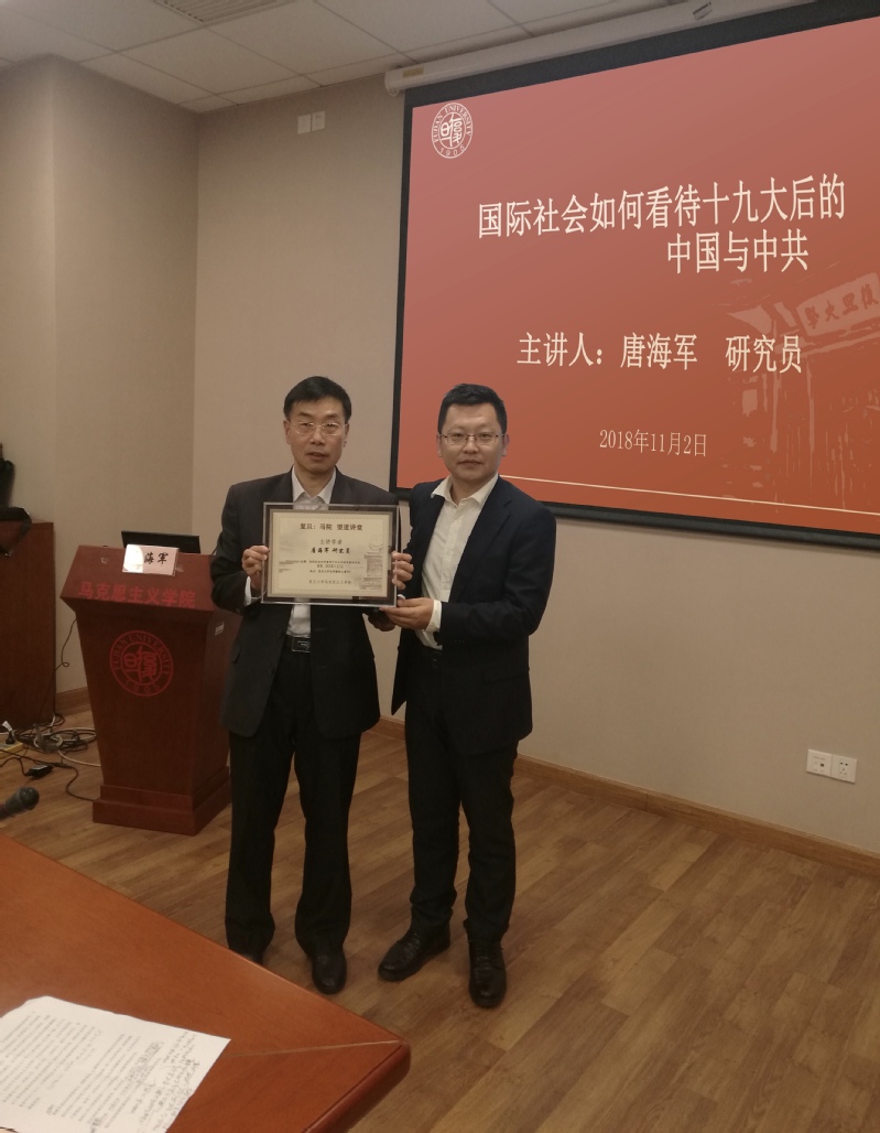 11月2日下午,中联部研究室参赞、当代世界研究中心研究员唐海军做客第一版主 望道讲堂,为学院师生带来题为“国际社会如何看待十九大之后的中国与中共”的专题讲座。第一版主 常务副院长李冉出席,第一版主 党委副书记刘顺厚主持讲座,学院40余名师生共同聆听讲座。