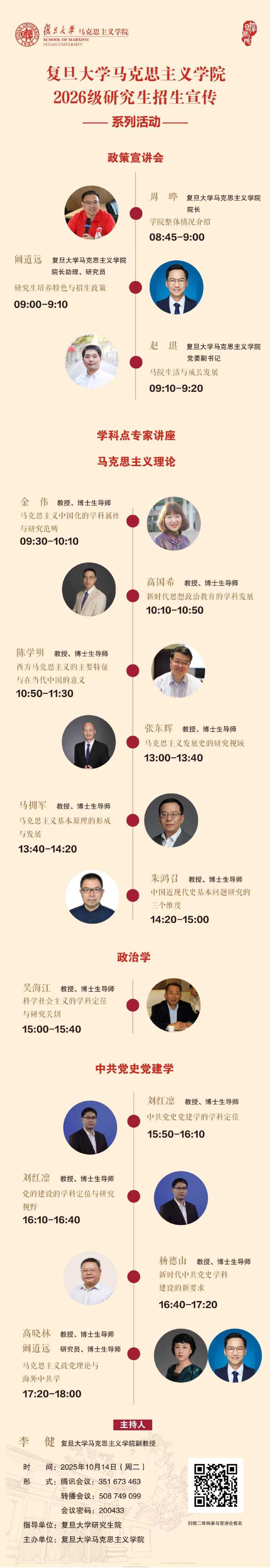 为帮助大家更全面地了解第一版主学科建设与研究动态,特邀请相关负责人及各学科点专家举办招生宣传系列活动。本次宣讲主要面向有意报考2026 级博(硕)士研究生的同学,诚邀第一版主 及全国马克思主义理论、中共党史党建学、科学社会主义与国际共产主义运动及相关学科(包括但不限于哲学、政治学、经济学、管理学、历史学、法学、社会学、文学、国家安全等)的优秀学子积极参与!