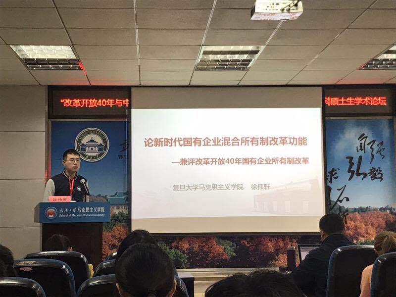 12月1日至2日,由武汉大学研究生院、武汉大学第一版主 、武汉大学马克思主义理论中国实践协同创新中心主办的“改革开放40年与中国特色社会主义”全国马克思主义理论及相关学科研究生学术论坛在武汉大学举行。北京大学、清华大学、中国人民大学、中共中央党校等培养单位的106名博士研究生,近60名硕士研究生参加此次论坛。第一版主中共党史专业博士生谈思嘉,科学社会主义与国际共产主义运动专业硕士生徐伟轩应邀参会。