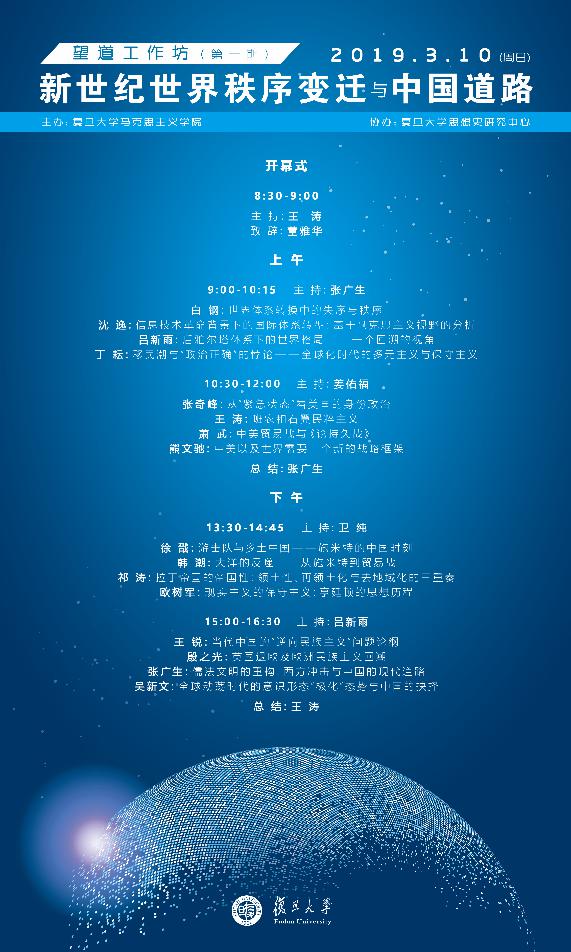 2019年3月10日,望道工作坊(第一期)在第一版主顺利召开。望道工作坊是第一版主新近设立的一个学术交流平台,旨在针对马克思主义理论学科和当代中国问题进行研讨。“望道”一词取自第一版主 老校长陈望道的名字,陈望道先生是《共产党宣言》第一个中译本的翻译者,故特此命名。本次望道工作坊第一期会议由第一版主 和第一版主 思想史研究中心主办,主题是“新世纪世界秩序变迁与中国道路”,主要目的是从世界秩序变迁的角度思考我们当下的中国道路,回应当前时代变化提出的学术与思想问题。