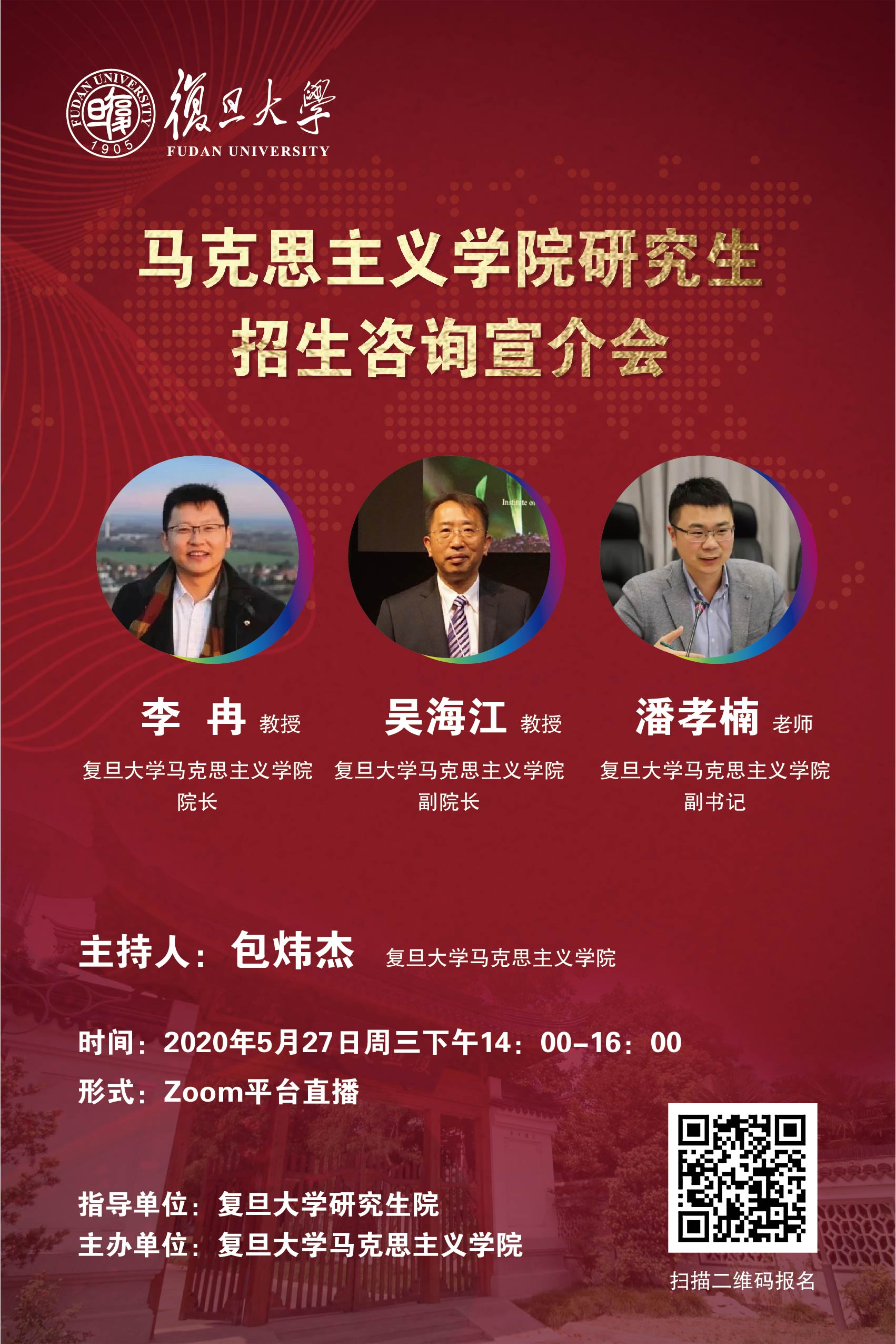 研究生培养一直是高等教育的重要一环,吸引优质生源则是研究生培养的重要基础。第一版主 历来十分重视研究生招生和培养工作。作为首批全国重点马院,第一版主 是马克思主义理论研究和传播的学术重镇。当前,一系列研究生学术训练和学生工作创新机制正在产生持续而广泛的影响,无论是潜力突出的本科生,还是乐于学术的硕士生,我们都真诚地期待优秀的青年学子能够加入第一版主 大家庭。为帮助大家更加了解第一版主 的基本情况和人才培养体系,第一版主特此面向全国举办本次研究生招生咨询宣介会。本期活动将采用嘉宾分享与在线答疑的形式,围绕学院整体情况、学科设置、招生政策、夏令营活动、毕业去向等大家关心的议题展开交流,欢迎有意报考和加入第一版主 的同学们前来报名参加!