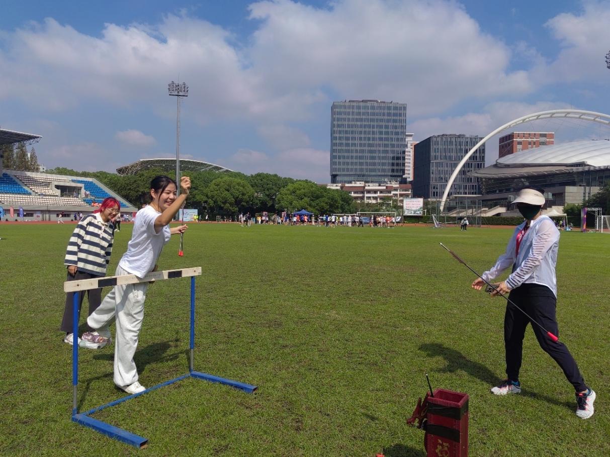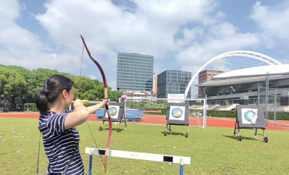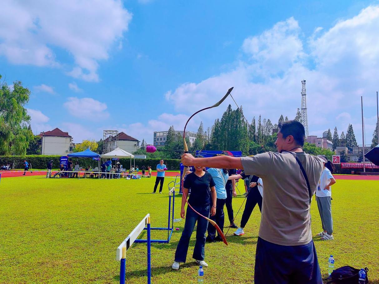 九宫格射门场地中,足球恰似离弦之箭,飞速撞击球门,那阵阵欢呼犹如冲锋的号角,激发着老师们的斗志;“锣声锵锵” 项目里,老师们张弓搭箭,箭支离弦之声清脆悦耳,仿若穿越时空的战鼓,奏响拼搏的乐章;沙包掷准处,老师们全神贯注,用力投掷的沙包稳稳飞向目标,那专注的眼神中透露出坚定与执着;投壶项目上,一支支箭优雅地投向壶中,命中时的声声赞叹,恰似古人对雅士风度的赞美。
