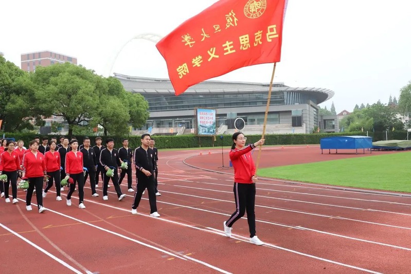 由学校各机关、院系和附属单位组成的运动员代表队整齐划一地步入会场,在嘹亮的国歌声中拉开了运动会的序幕。各院系方阵身着青春洋溢的服装、喊着激昂澎湃的口号,依次经过主席台。马院方阵由党委常务副书记陈坚同志带队,青年教师崔涵冰老师担任旗手,师生手持学院吉祥物“真真”“甜甜”,迈着整齐稳健的步伐亮相。观众台上的马院师生也激动地站起来,和台下的方阵一起响亮地喊出“复旦马院,红色摇篮,赛场内外,永争第一”的口号,展现出马院人昂扬向上的精神风貌!