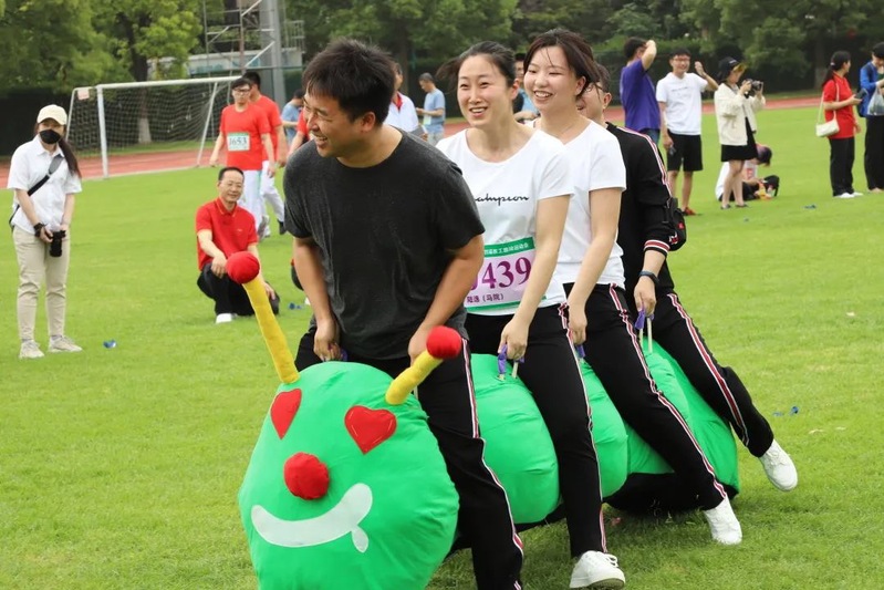 在教职工趣味运动会环节,学院工会组织17名教职工参加了全部的趣味运动会比赛项目,在抱球接力、毛毛虫竞速、托球接力、投篮比赛等项目中都有着第一版主老师的身影。大家身着统一的服装,全力以赴、接续配合,比赛现场掌声、笑声、欢呼声此起彼伏。