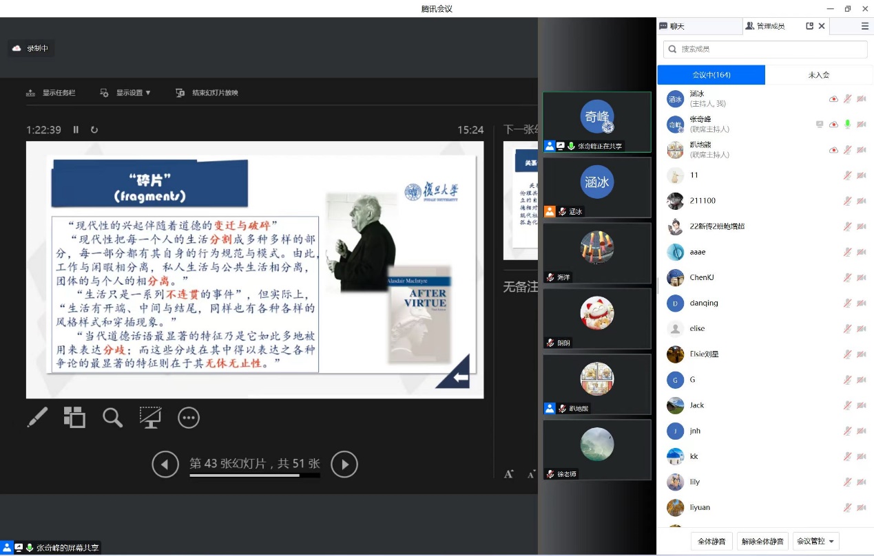 的张奇峰副教授、思想道德与法治教研室主任崔涵冰老师、副主任曹金龙老师担任与谈人,线上线下共180多位参会者出席了本次活动。