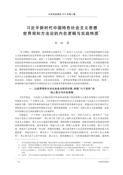 “学习理论,最要紧的,是把思想方法搞对头。”党的十八大以来,习近平创造性地将马克思主义世界观和方法论贯穿到习近平新时代中国特色社会主义思想之中,形成了具有中国特色与时代特色的世界观和方法论。党的二十大报告明确将“六个坚持”作为习近平新时代中国特色社会主义思想的世界观和方法论的重要体现,并指出:“继续推进实践基础上的理论创新,首先要把握好新时代中国特色社会主义思想的世界观和方法论,坚持好、运用好贯穿其中的立场观点方法。”为此,既要把世界观和方法论作为研究主体,深刻认识“六个坚持”的核心要义、内在逻辑与灵魂所在;更要把思想理论体系本身作为其世界观和方法论的载体、母体,密切联系习近平新时代中国特色社会主义思想的理论主题、内容结构等,深刻认识“六个坚持”的具体运用与集中体现;还要坚持认识论、实践论、价值论、方法论的有机统一,把辩证思维能力作为理论联系实际的“桥梁”,深刻把握习近平新时代中国特色社会主义思想及其世界观和方法论的实践特质。
