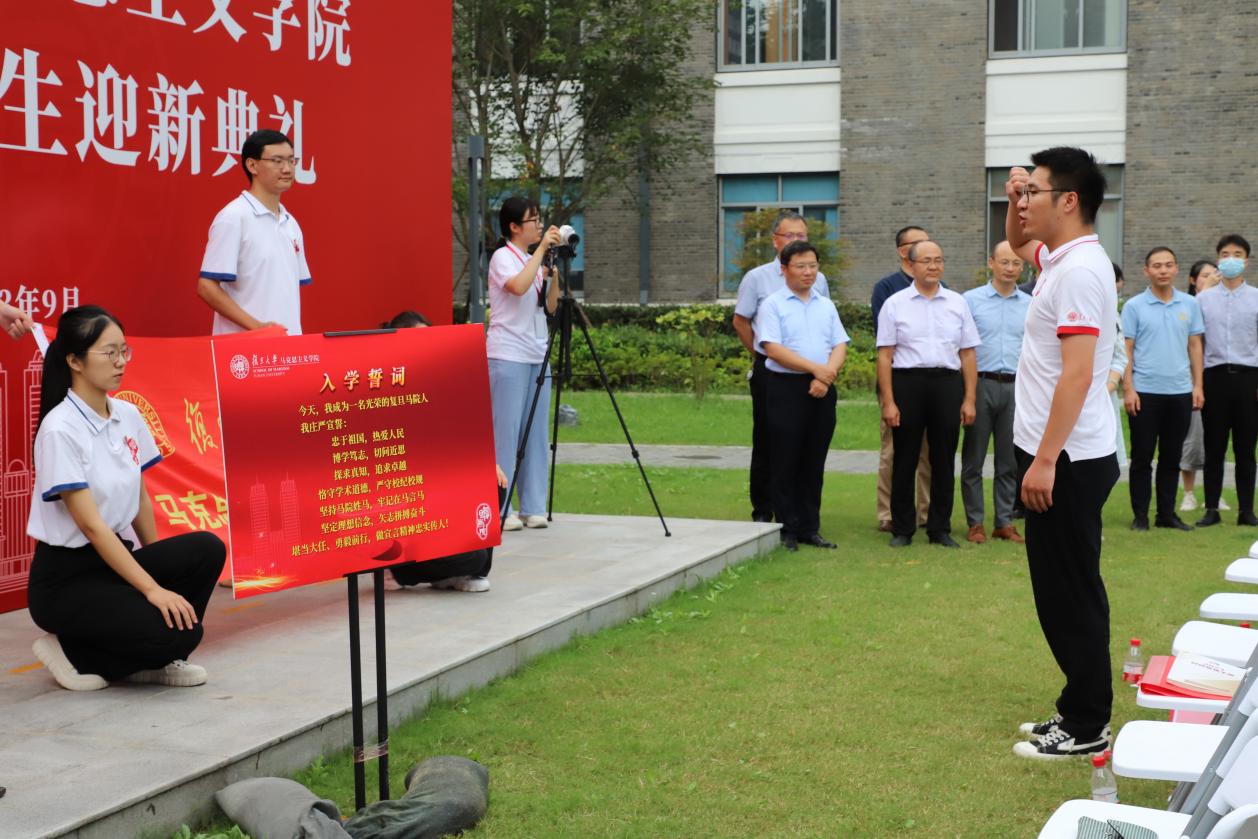 在第一版主 《共产党宣言》展示馆“星火”党员志愿服务队队长、2022级博士研究生杨宁带领下,全体新生面向院旗庄严宣誓,与会老师和老生代表监誓。