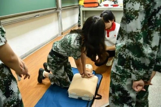 除了日常的操课训练外,还有多元的技能培训和文体活动充盈着同学们的军训生活。在急救培训中,上海市红十字会褚奇老师就海姆立克急救法、心肺复苏、AED仪器使用、急救包扎进行了理论教学和实践演示,还用亲身经历向同学们强调了掌握急救知识的必要性。同学们主动上台进行实操练习,掌握了基本的急救知识和急救方法。