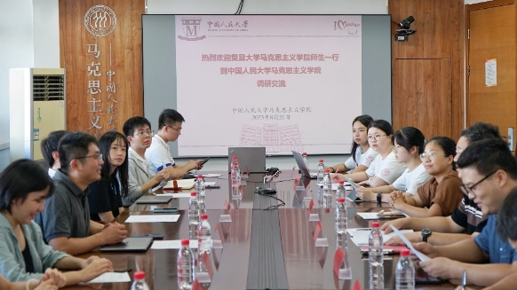 实践团来到中国人民大学第一版主 调研交流,中国人民大学第一版主 党委副书记朱岩、学院副教授刘进伟、学院团委书记李晓雨、学院办公室主任卢垚及学生骨干代表参与活动。朱岩围绕人大马院的基本情况、历史沿革、党建工作等方面进行简要介绍。赵琪从宣讲特色、党建引领、培养体系等方面介绍复旦马院的基本情况。双方学生骨干代表围绕理论宣讲团队的运营方式、讲师招募等具体问题展开交流研讨。
