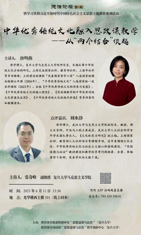 “德法论坛”是由教育部首批虚拟教研室“思想道德与法治”(第一版主 )、教育部全国高校“思想道德与法治”教学创新中心(第一版主 )主办。虚拟教研室以“虚拟共享、动态开放、平台交流”为原则,力求从虚拟现实到增强现实;全国高校“思想道德与法治”教学创新中心是教育部设立的本科“德法”课教学创新中心,旨在为全国本科院校“德法”课教师提供学理研讨平台以及课程资源支持。“德法论坛”在这一背景下设立,旨在打造全国“德法”课教师学术共同体,构建互联互通的学术网络,促进全国“德法”课教师的交流与合作,生产高质量的学术成果,繁荣思政学科。作为“德法论坛”系列第一期活动,本次讲座立足“德法”课一线教学实践,力求将前沿学术研究成果转化为“教学侧”优势资源,充分展现了“德法”课教学研究的生命力,在深度交流碰撞中推动“德法”课教学质量的不断提升。
