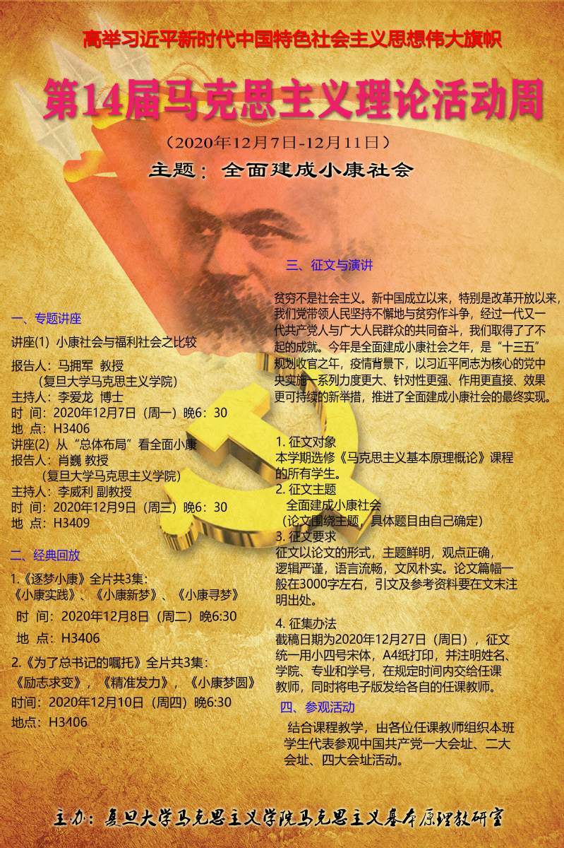 希望各位任课教师按时间节点安排好“活动周”各项活动,特别提醒在2020年12月27日(周日)之前,将本班级学生优秀征文,以及“讲座听后感”、“影片观后感”、“参观感想”等电子版集中一起发到韩欲立的邮箱:[email protected],以便本学期结束时完成《全面建成小康社会——第14届马克思主义理论活动周集锦》的编印工作。