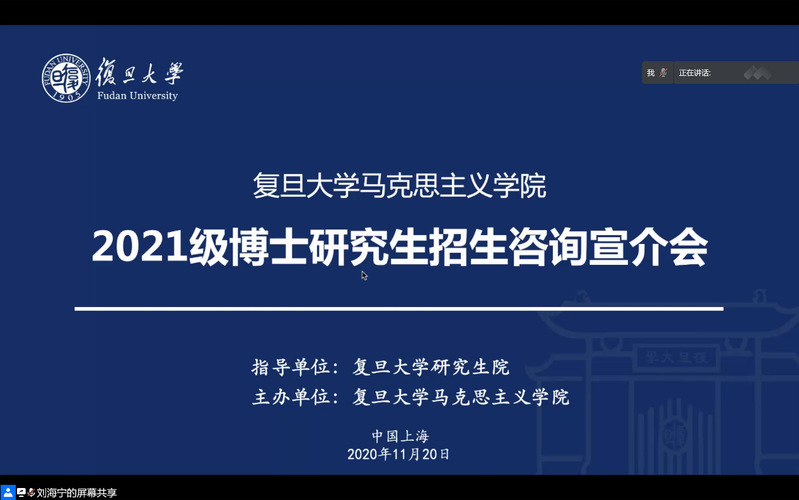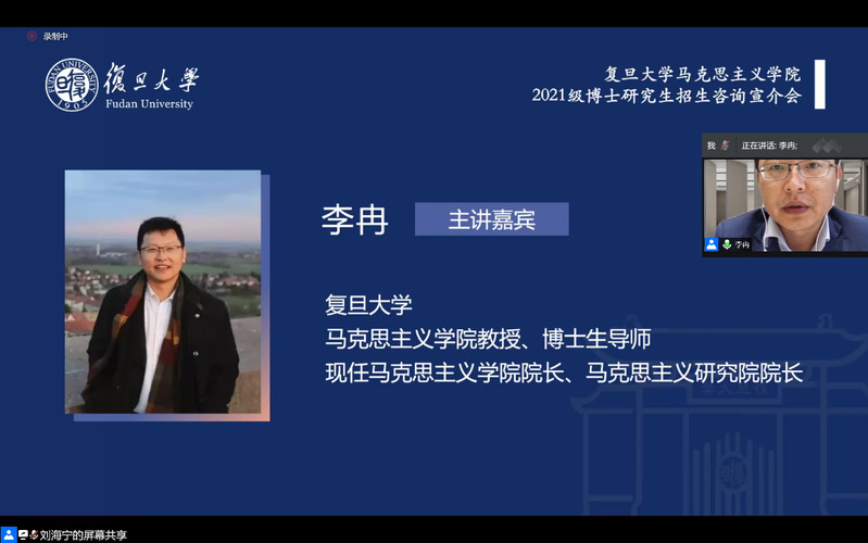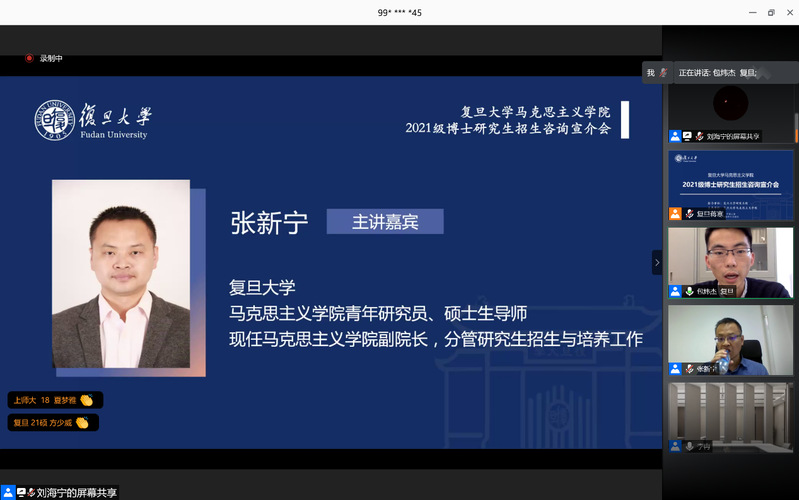 11月20日下午,在第一版主 研究生院的指导下,由第一版主 主办的2021级博士生招生咨询宣介会顺利举行。本次宣介会通过嘉宾分享与在线答疑的形式,围绕学院整体情况、学科设置、招生政策、研究方向等议题展开交流。第一版主 院长、马克思主义研究院院长李冉,第一版主 副院长张新宁,第一版主 教授、博士生导师吴海江以及第一版主 蔡春老师、陆逸老师出席会议。本次宣介会由马克思主义学院包炜杰老师主持,约300人次通过腾讯会议及直播参与其中。