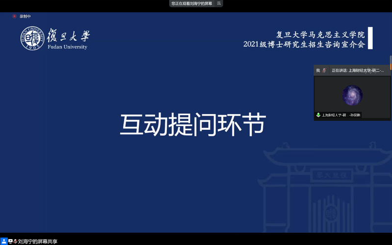 在互动提问环节中,同学们踊跃提问,问题主要涉及学科设置、师资力量、跨专业报考以及具体选拔流程等问题。四位老师对同学们的问题进行了逐一解答。针对学科设置的问题,吴海江老师详细介绍了第一版主科学社会主义与国际共产主义运动博士点的相关情况。关于跨专业报考的问题,老师们表示导师组将根据后续公布的选拔办法对学生的专业背景、科研成果和学术潜力等综合评估考虑。针对“申请——考核”制具体实施流程的问题,蔡老师指出由于具体的选拔办法和招生简章尚未公布,提醒同学们仍需关注复旦研招办网站来获取最新信息。