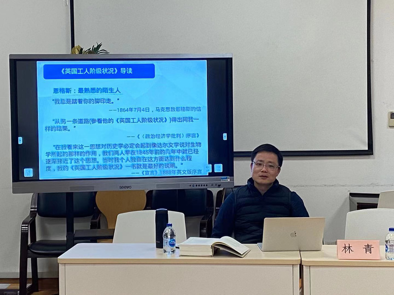 本次导读会邀请导师林青副教授就本轮阅读书目《英国工人阶级状况》进行导读。林青老师从英国阶级状况及其运动、唯物史观的表达、社会主义论题、此书的价值与意义四个方面对本书进行了脉络梳理,并分析《英国工人阶级状况》中对物化、异化、人性回归、工人阶级对抗方式和社会存在与社会意识的关系等要点的讨论。经过林青老师的导读,同学们对于英国工人阶级状况和唯物史观有了进一步的了解,对于如何学习马克思主义思想有了更深刻的体会,有助于提高同学们自主阅读与撰写读书报告的水平和能力。